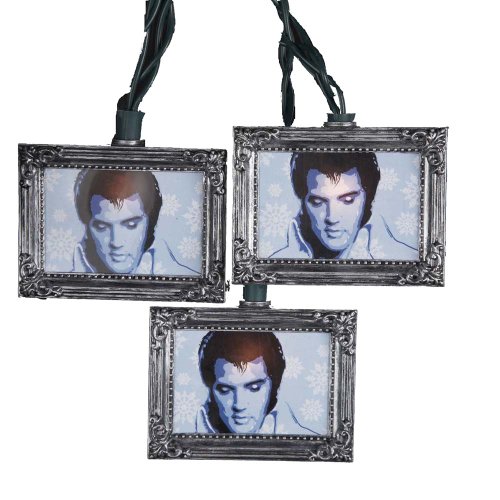 This Kurt Adler 10-Light Elvis Presley Picture Frame Light Set is a fun, festive way for any Elvis Presley fan to add to their holiday decor or display. Each light on this novelty set is an ornate silver picture frame holding a photo of the King-Foots face, tinted blue to match the photo-Foots blue-and-white-snowflake background. This set has 12-Inch spacing, and comes with a 30-Inch lead wire, 4 spare bulbs and 2 spare fuses.